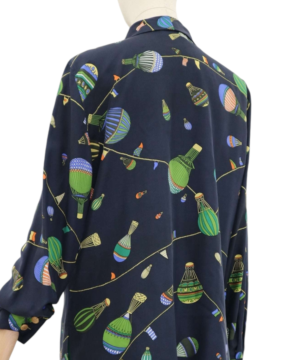 This 100% Silk Vintage shirt by Betty Barclay features a fun hot air balloon pattern and bounty flags in bright hues of green , blue, orange and yellow on a dark blue font. This shirt has a spread collar, button placket and long sleeves.