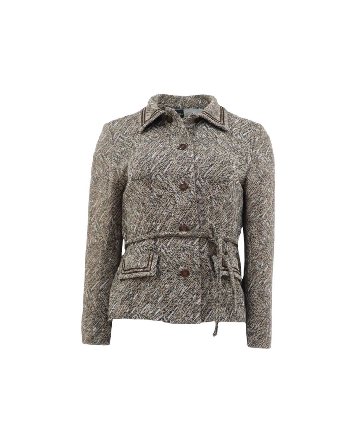 Vintage 2 Piece suit by Glaser. This suit features a jersey knit blazer with non-functional pockets, buttoned placket, self-belt and a convertible collar. It's beautifully tailored with a nipped in waist and contrast details on the collar and pocket flaps.