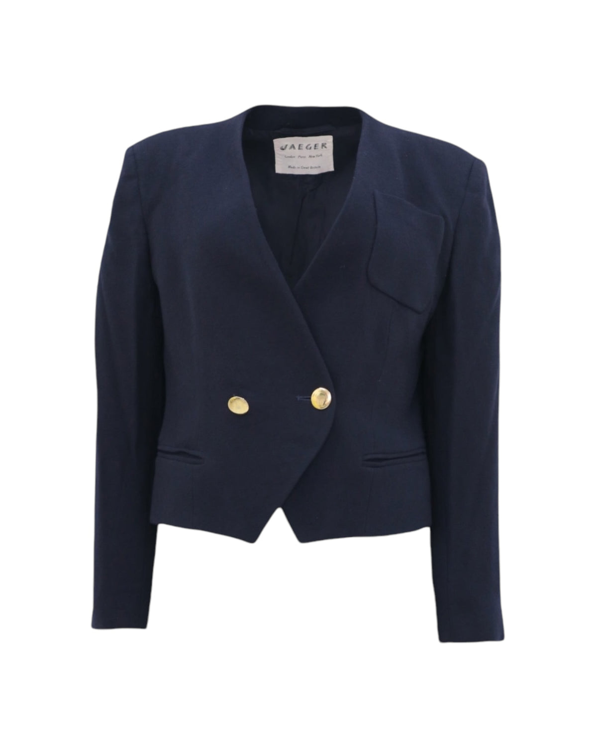 Vintage Jaeger cropped blazer with open-front silhouette, clean neckline and darted front.It’s finished with jetted pockets and fashion buttons. This blazer is made from 100% wool.