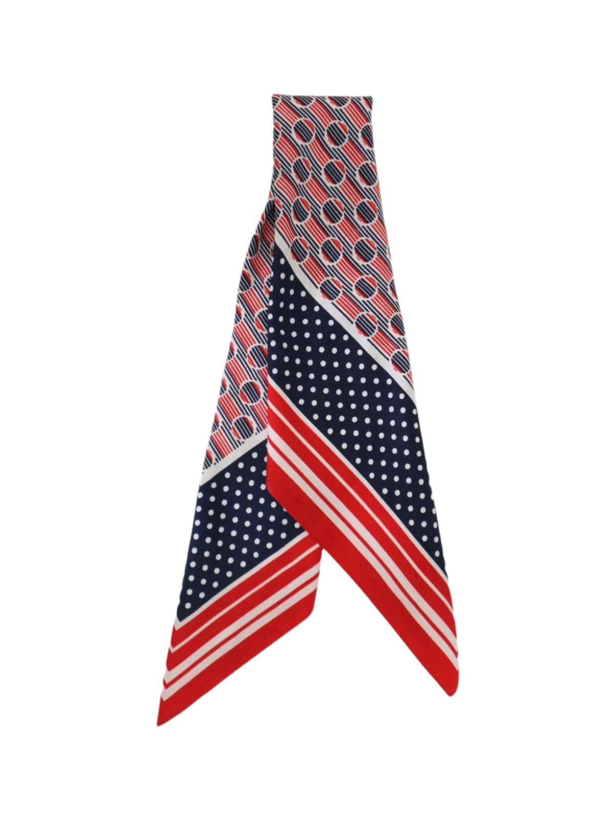 Vintage scarf featuring a geometric pattern in hues of white, blue and red.