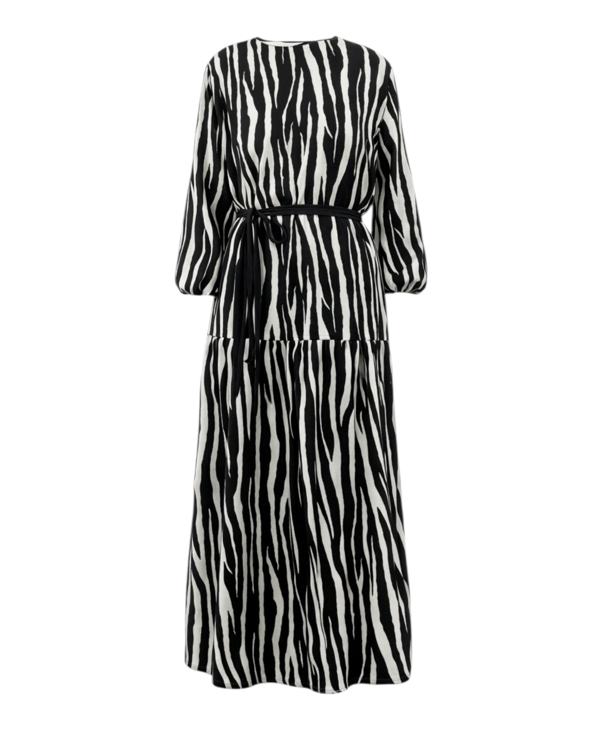 Experience the exquisite beauty and luxury of our handcrafted Mystic Moods Zebra Maxi Dress. Made in England from remnant fabric, its sleek crew neck and elegant dropped waist exude impeccable taste. The self-fabric tie fastening at the back adds a touch of refined class, making it the perfect statement piece for those seeking exclusivity.