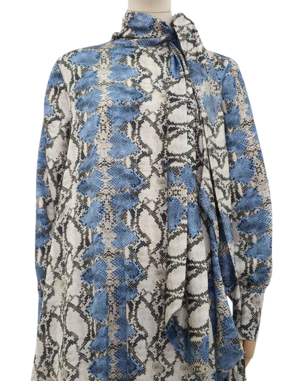 Pre-Owned Luxurious Tie Halter Neck Maxi Dress with long sleeve. This dress features a loose fit, a tie halter neck , zipper fastening at back and bishop sleeves with buttons closure. There are no labels to indicate the brand and fabric.