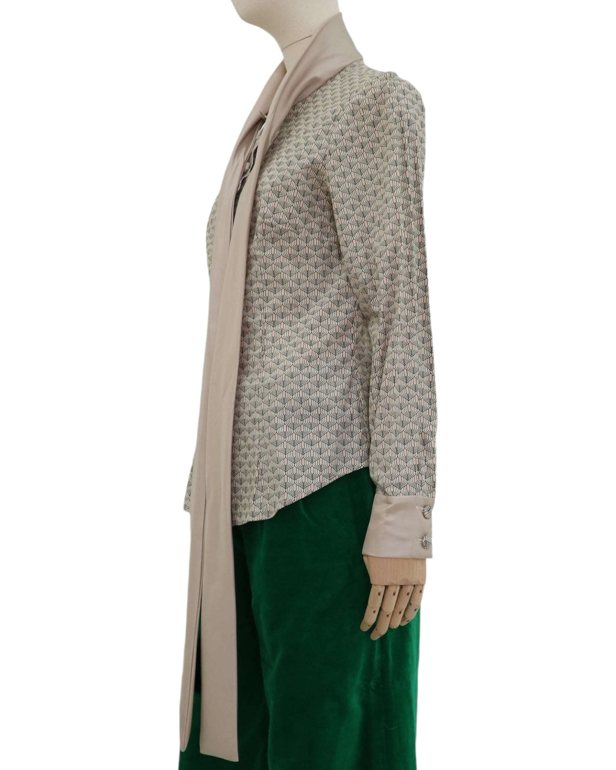 Elegant and smart, Vintage Hand-made shirt with self-covered buttons, contrast cuffs and tie neck. This shirt features a geometric patterns and a slim fit cut.