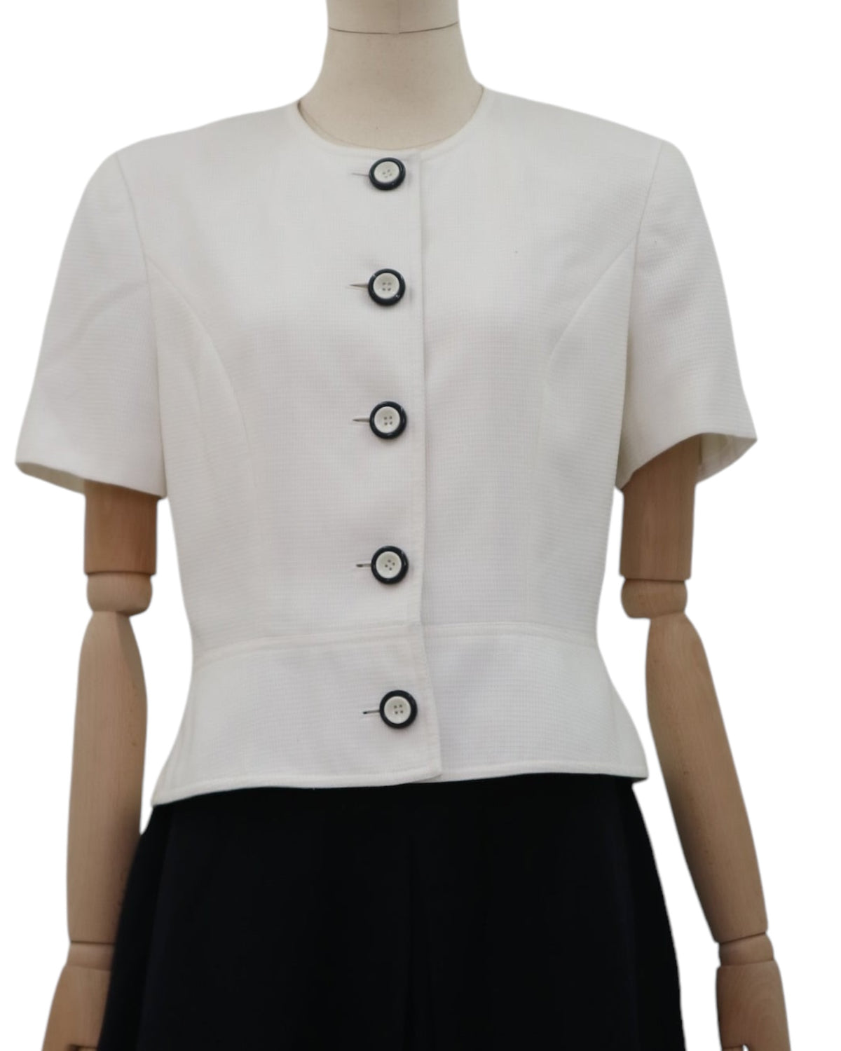 Vintage short sleeve blazer featuring a waffle texture fabric in pure white, buttoned front, crew neck and peplum waist. The blazer is beautifully finished and has a versatile simplistic look.