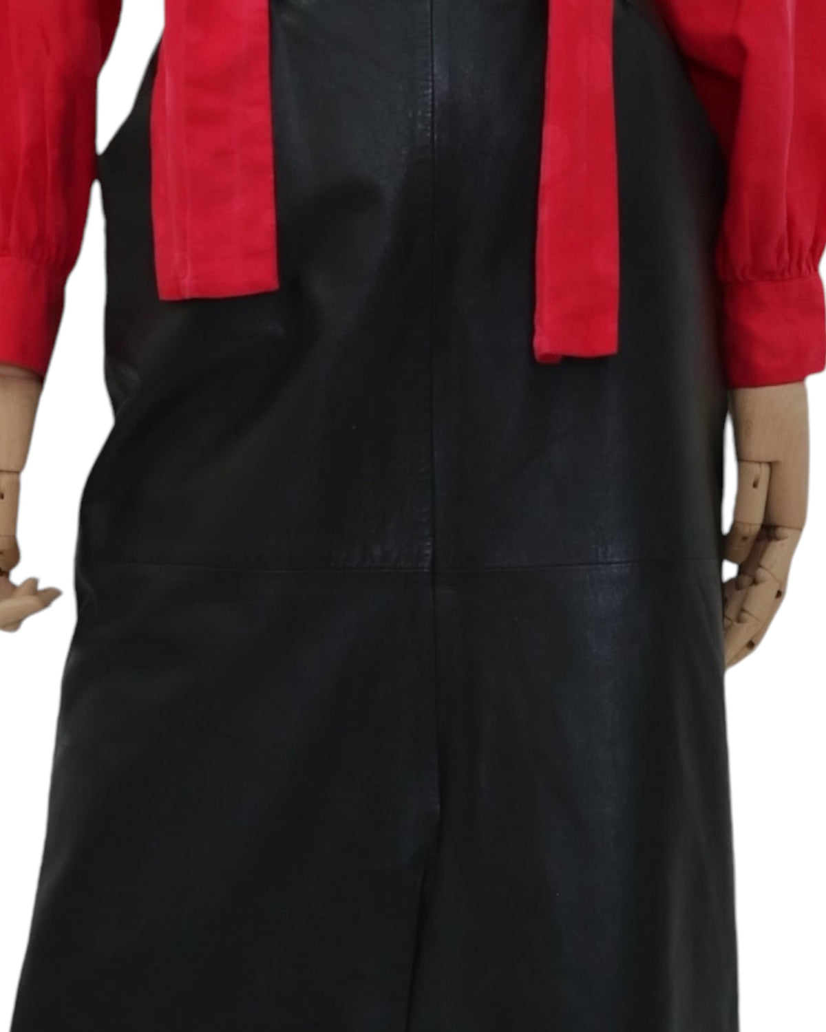 Vintage leather skirt with open slit at the front and back, high waist, side pockets and zip and button fastening at the back.
