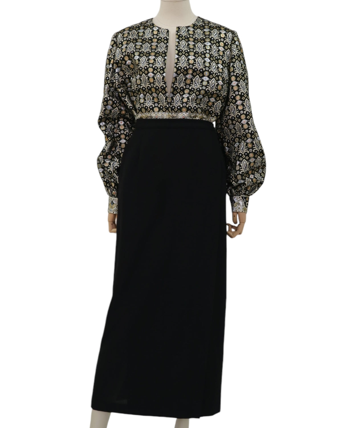 This vintage style matching features an open front top with crew neck, long sleeves with cuffs and a maxi wrap skirt with button fastening