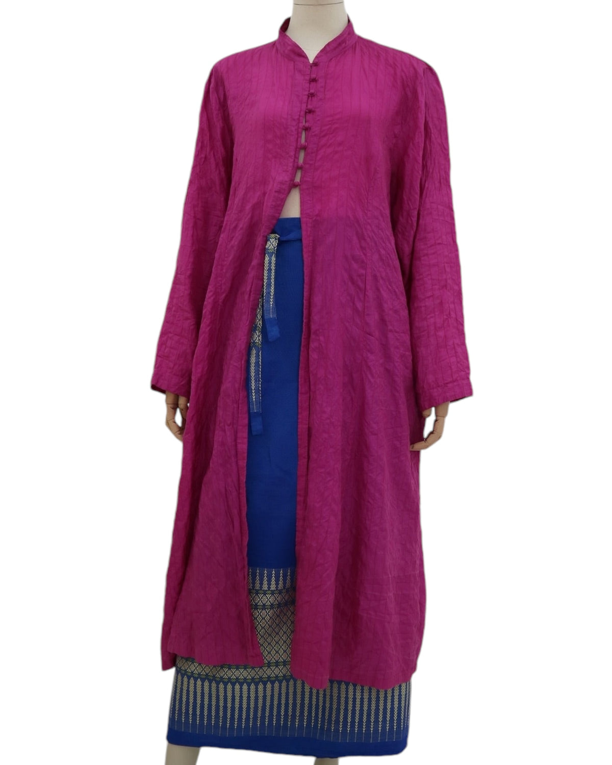 This style matching vintage set features a hand-made top made from 100% silk. This top features hand made buttons a stand collar and  long sleeves. The skirt is hand-made from 100% silk and features gold floral embroidery and adjustable tie waist.