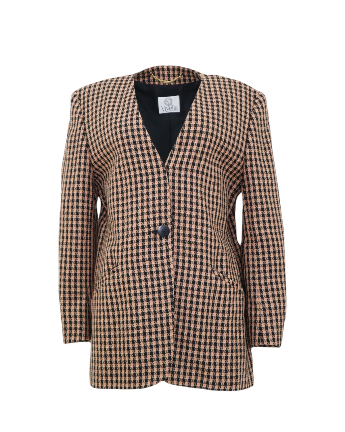 This vintage summer jacket features a tailored fit, buttoned placket and cuffs, soft shoulder padding and jetted pockets with flaps. It's collarless with a rounded hem and checkered patten in hues of pink and black with subtle gold details.